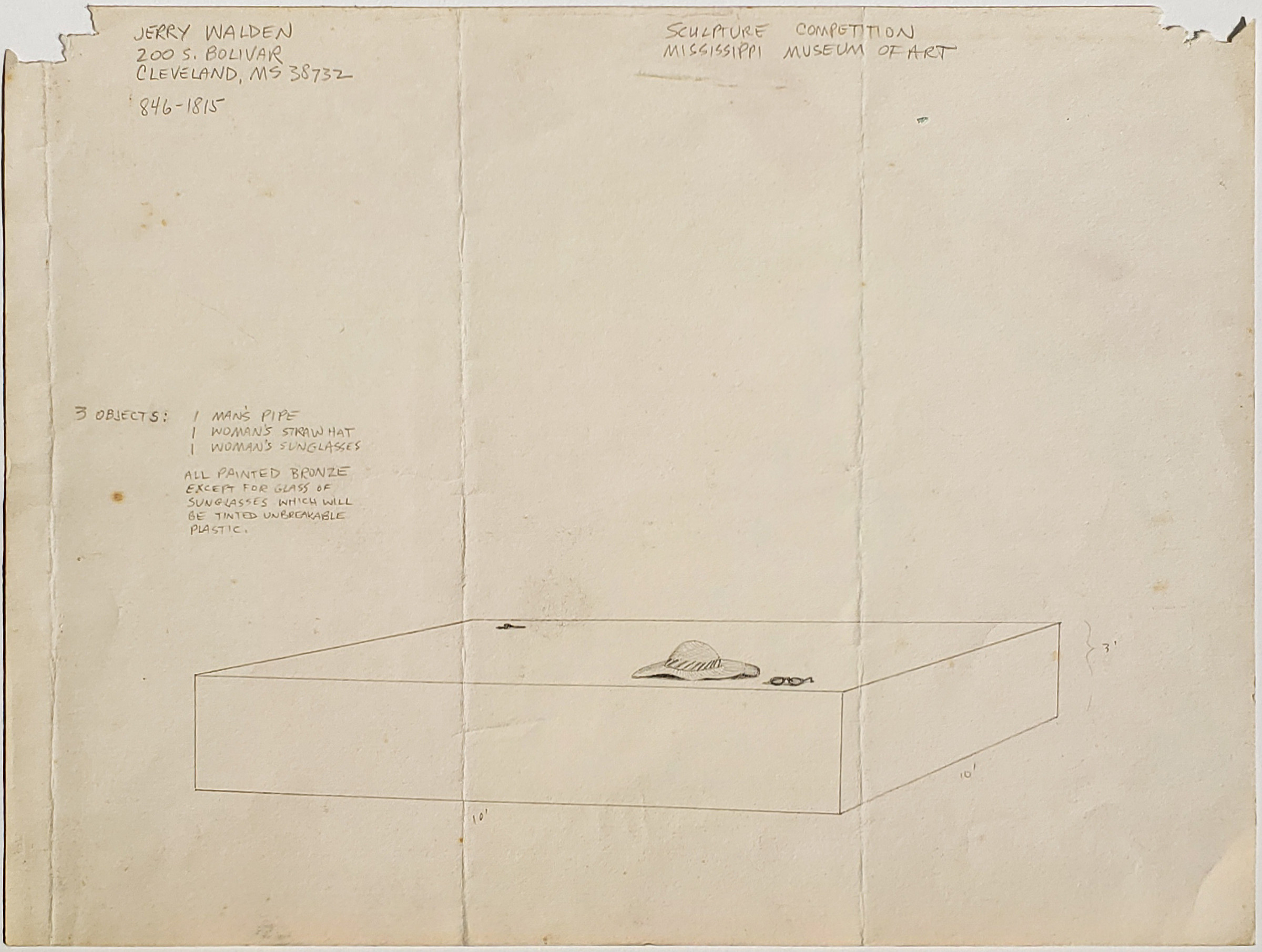 In 1978 the newly founded Mississippi Museum of Art in Jackson initiated a sculpture competition to inaugurate the opening of the new museum. This is the first, last minute, drawing for an outdoor sculpture that Jerry submitted. The museum requested he redraw his plan and resubmit it to the selection committee, which he did. (See his second submission drawing). He won a $250 Merit Award but not the final commission. The juror was John Fuhr, Director of Exhibitions and Lectures, Sculpture Corporation, Chicago, IL.