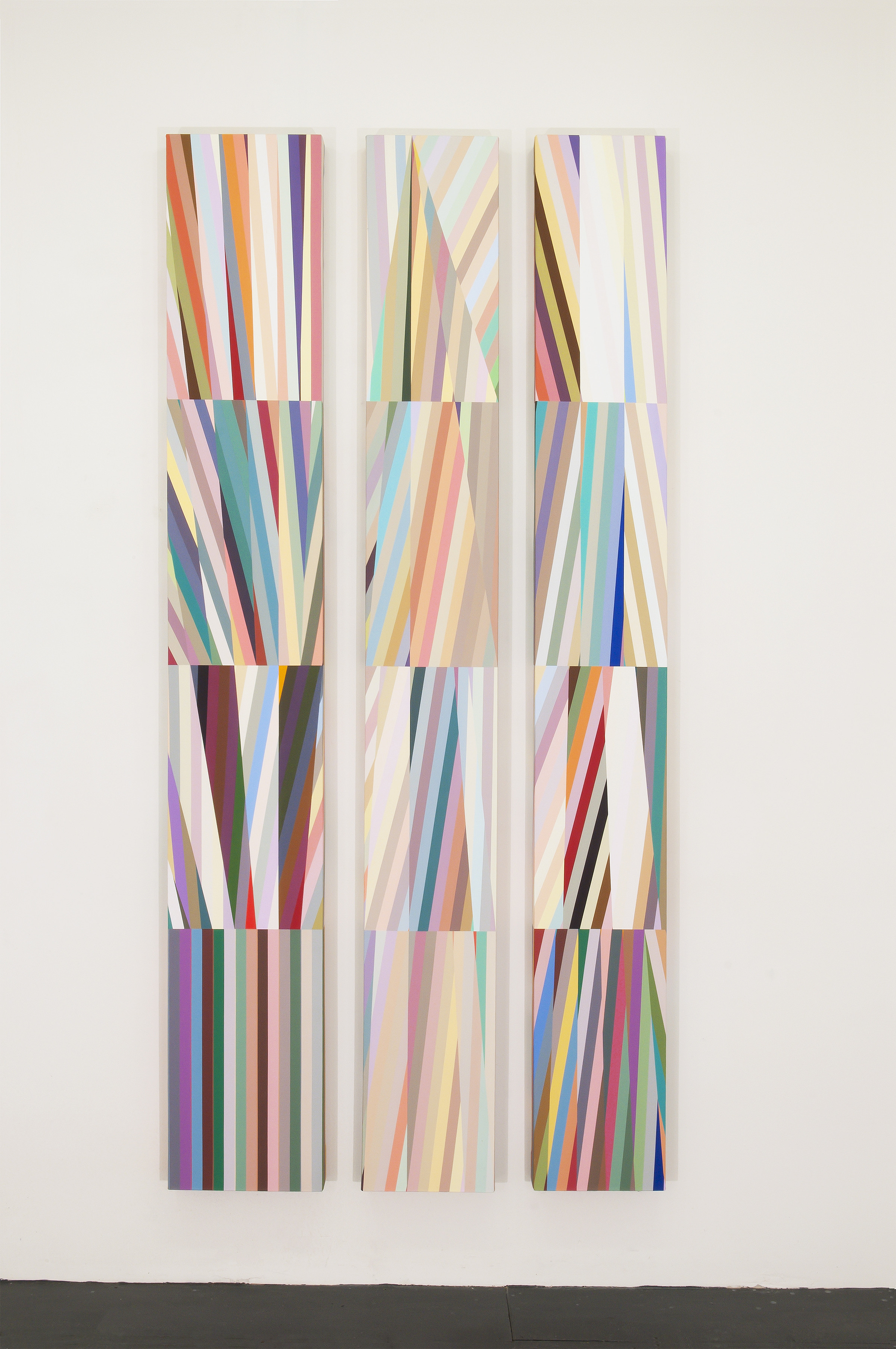 Left canvas: 96" x 14" (2.4m x 36cm); middle canvas: 96" x 12" (2.4m x 30cm); right canvas: 96" x 12" (2.4m x 30cm); arranged 3¼" (8cm) apart