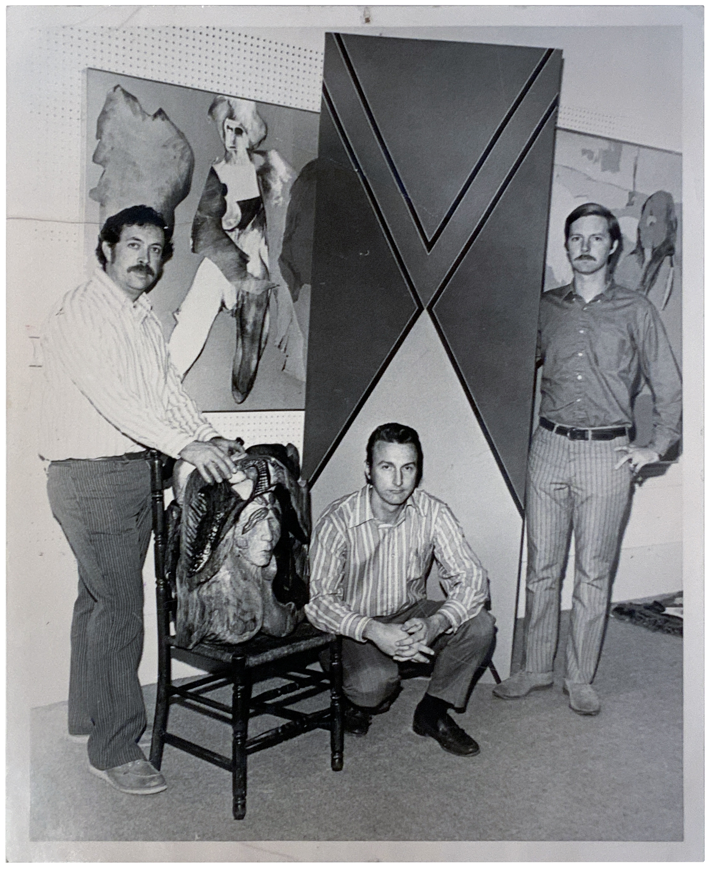 Jerry next to his painting "Slices of the Company Pie" with Fellow Delta State College professors Jack Willis, his paintings and Floyd Shaman with his sculpture,