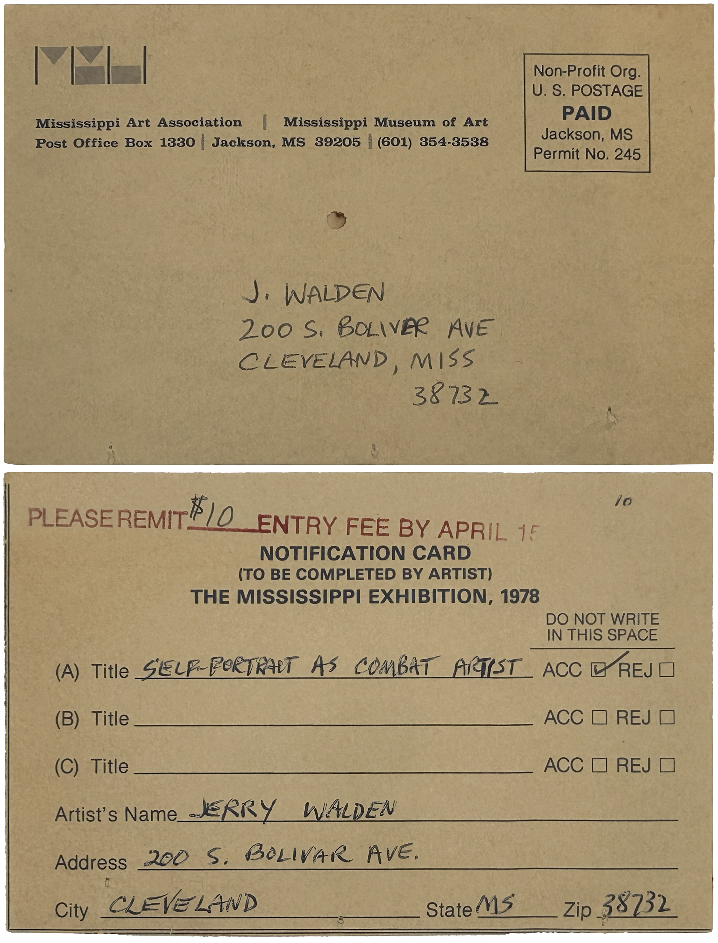 "The Mississippi Exhibition, 1978" Notification Card, Mississippi Museum of Art, Jackson, MS,