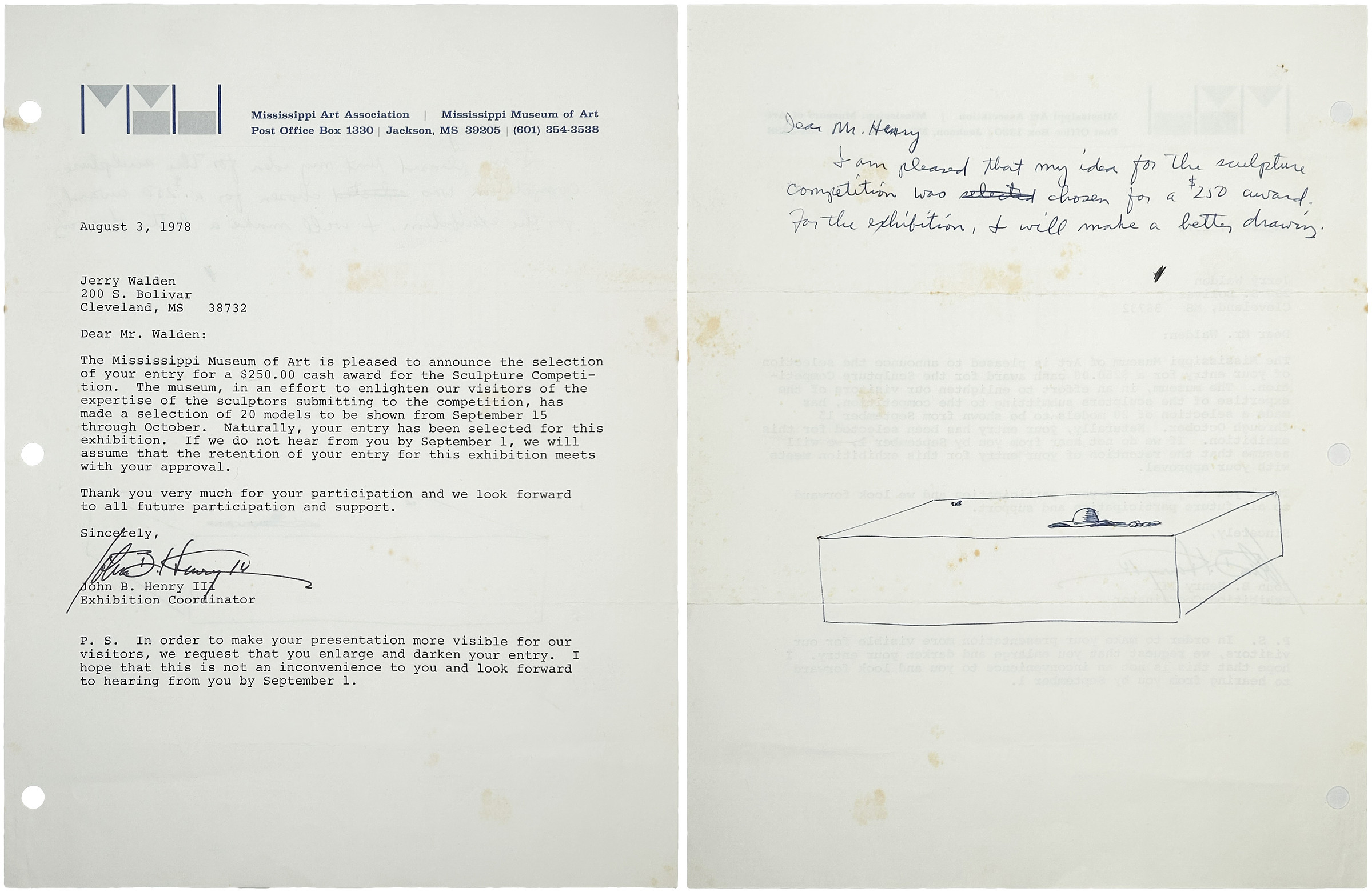 Merit Award Letter for the Mississippi Museum of Art Sculpture Competition,