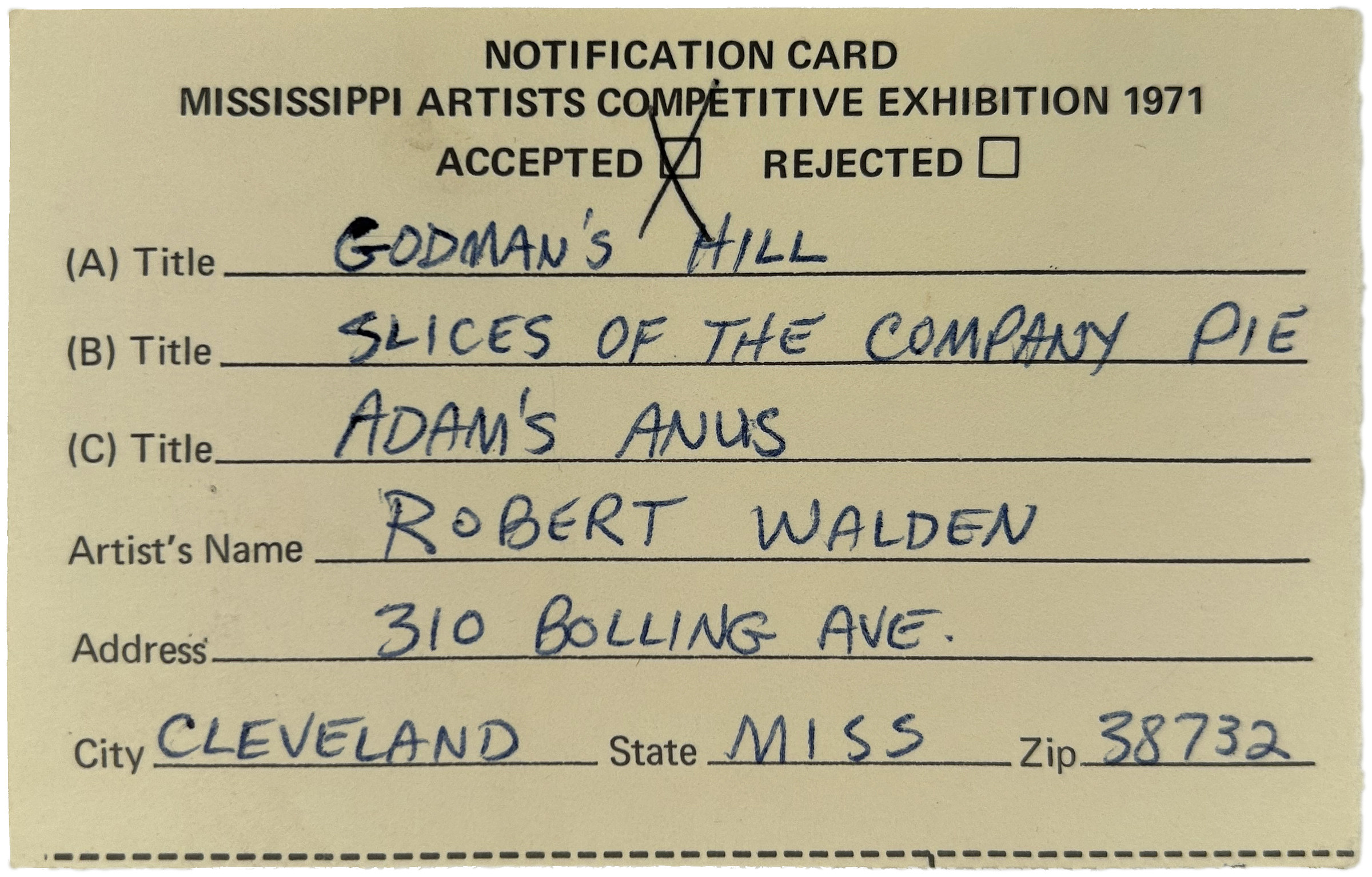 Misissippi Artists' Competitive Exhibition 1971 Notification Card,