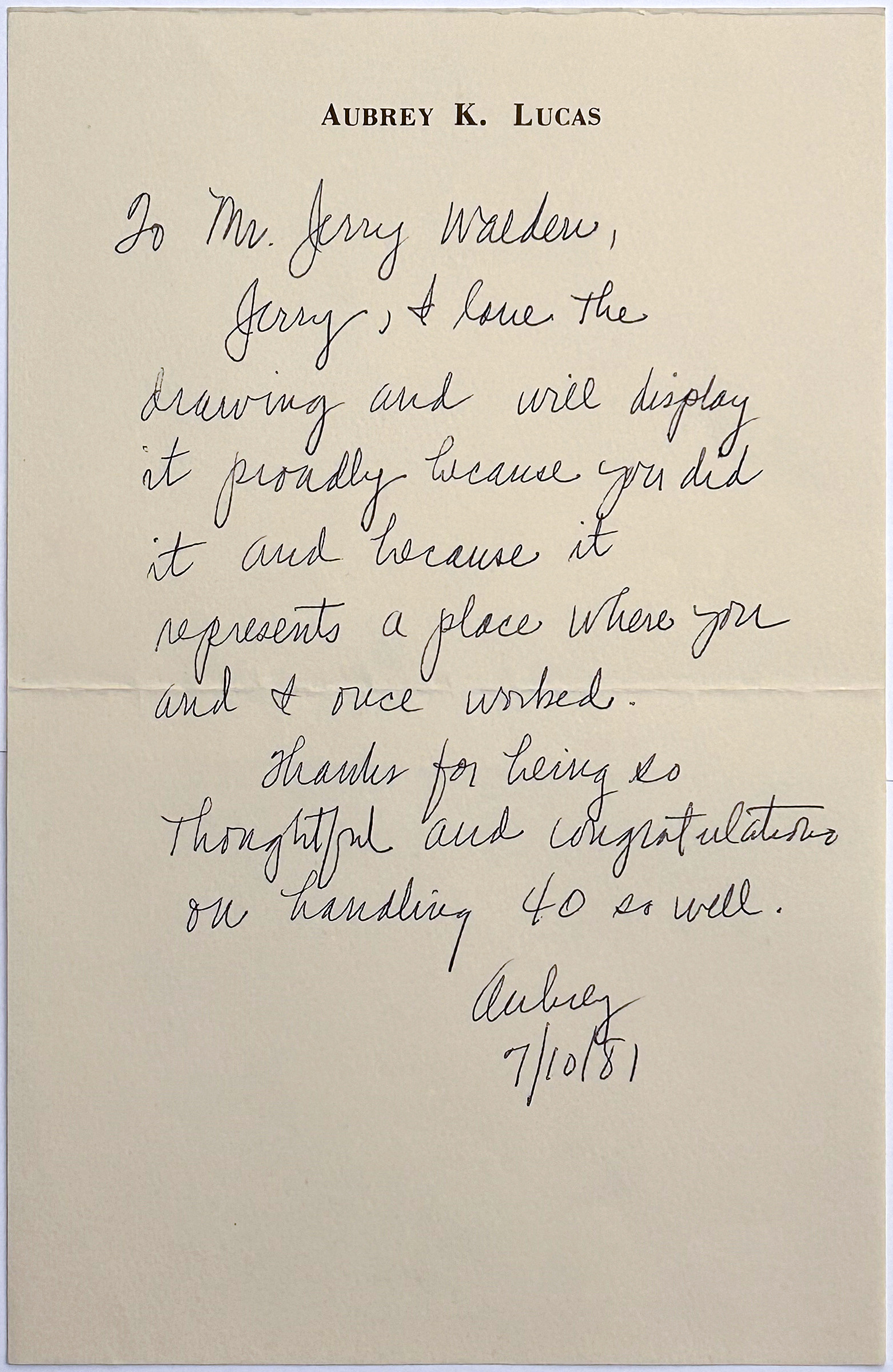 Sent to Jerry in appreciation of a drawing Jerry made of the the Marion Clower Johnson Natatorium on campus that would be made into the president's official Christmas card that year.