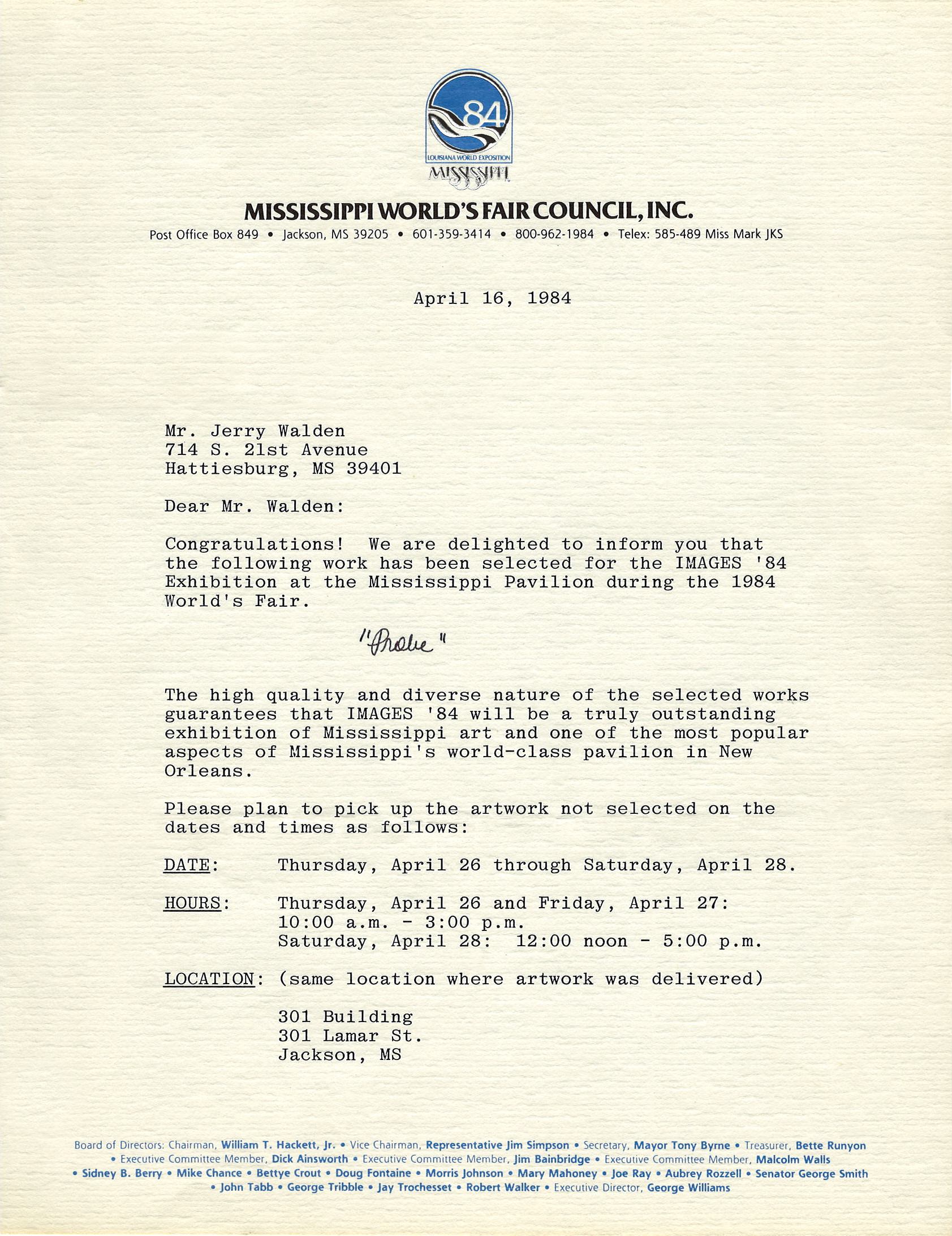 Acceptance letter for the "Images '84" Exhibition at the Mississippi Pavilion at the Louisiana World Exposition, New Orleans, LA ,