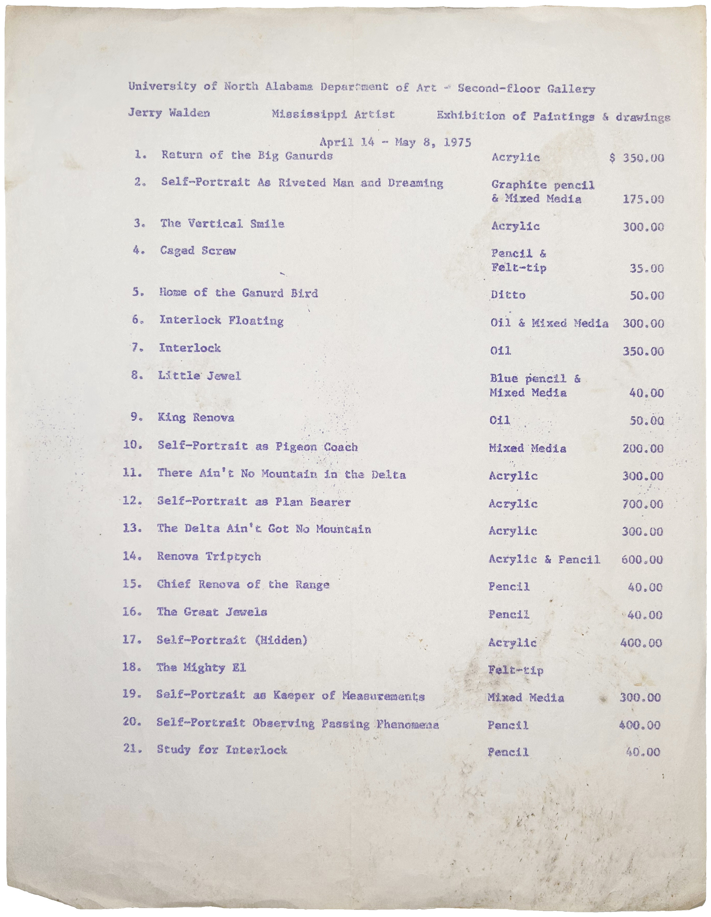 Staff Writer, The Birmingham News, Birmingham, AL, April 14, 1975, "UNA Sponsors Art Exhibit By Jerry Walden", pg. 23