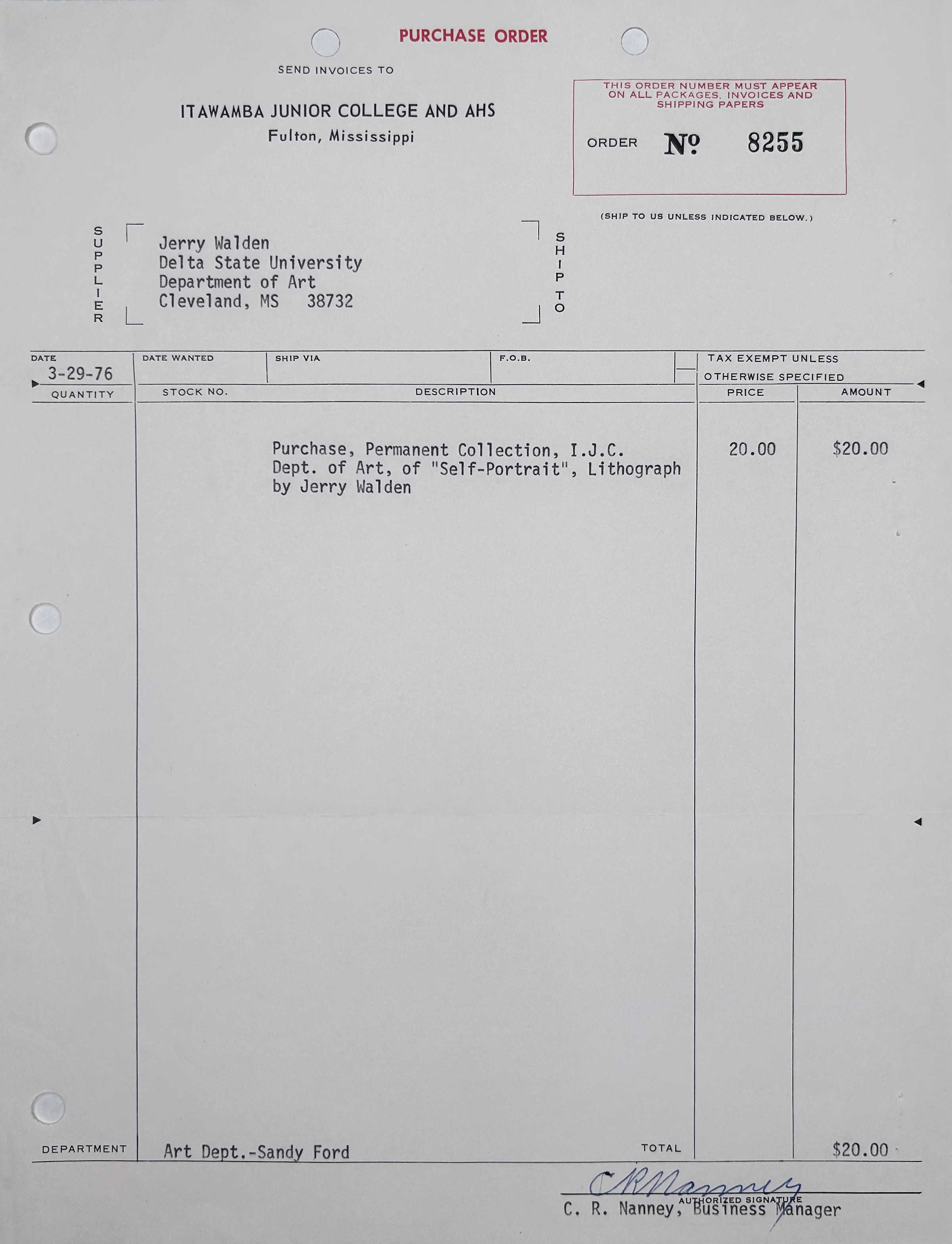 Purchase Order for "Self-Portrait" for the Permanent Collection of Itawamba Junior College,