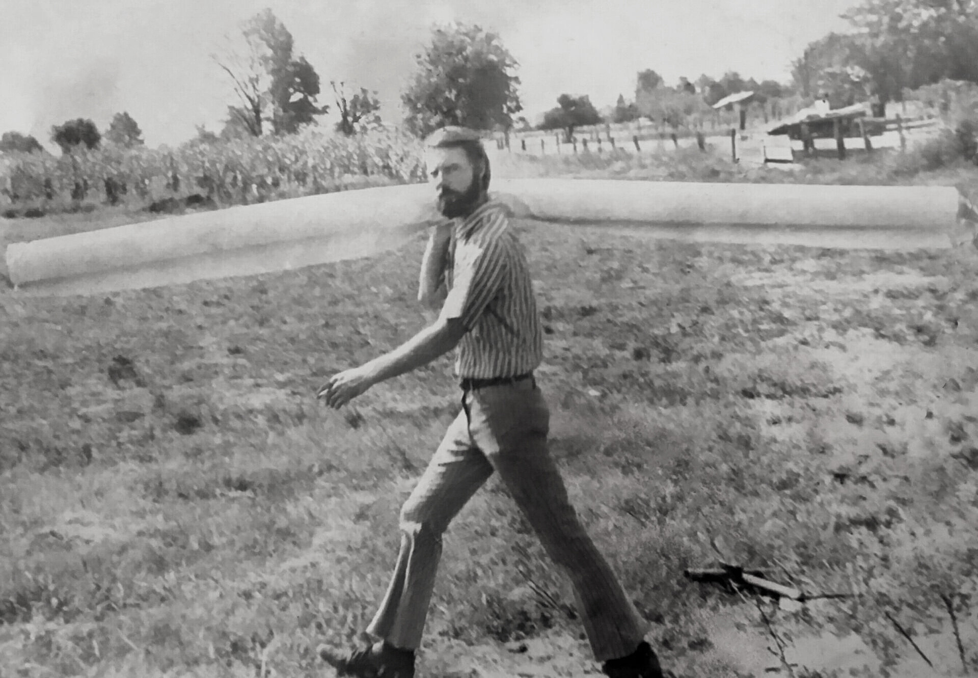 Jerry carrying a roll of canvas outside his Renova, MS studio ca. 1973.